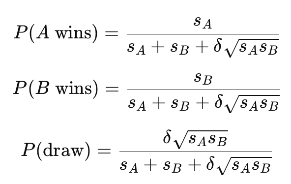 Para modelar os confrontos, vamos usar um modelo semelhante ao usado no sistema Elo do xadrez, mas com uma adaptação para incluir a possibilidade de empate (modelo Bradley–Terry–Davidson). A partir da pontuação de cada time, se calcula um fator de força (sA = força, rA = pontuação).